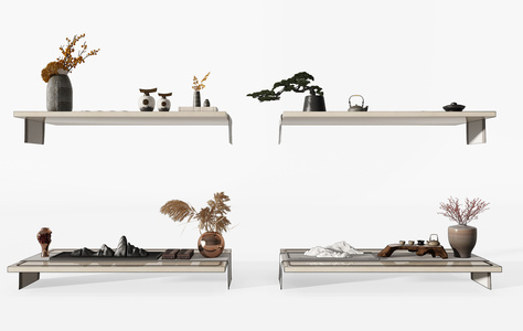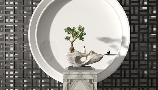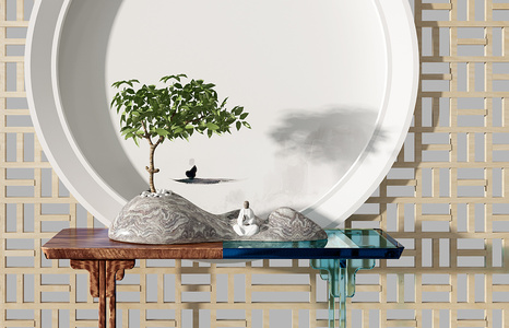 Z30-0708新中式禅意玄关摆台柜架植物石头摆件饰品