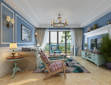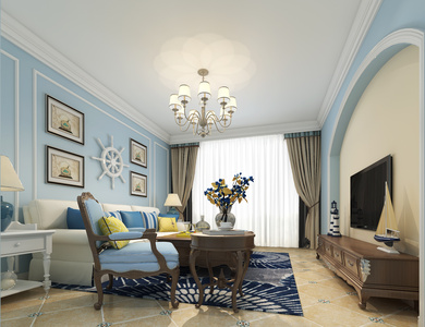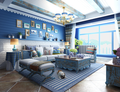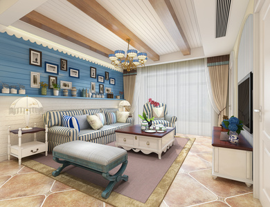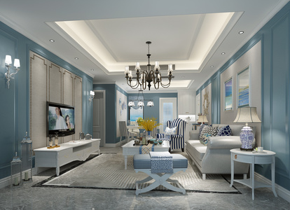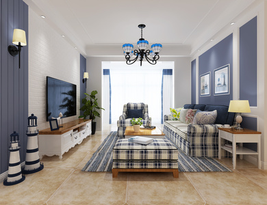 H19-0710现代地中海式客厅沙发茶几画框照片墙电视柜台灯