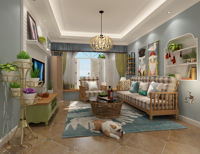 H22-0710现代地中海式客厅沙发茶几彩绘玻璃吊灯宠物狗