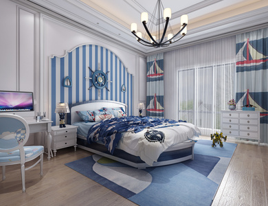 H25-0711现代地中海儿童房男孩房鲨鱼书桌写字台木床珊瑚吊灯海盗船长船帆