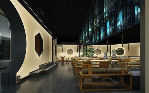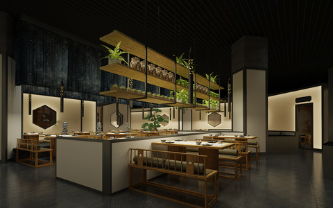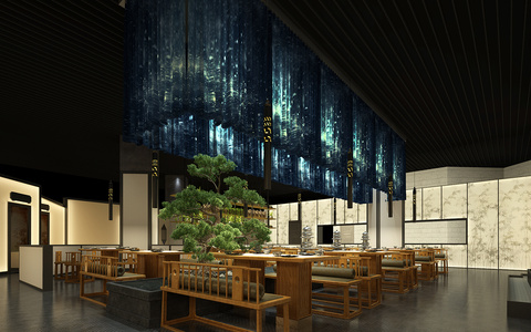 Z03-0702新中式自助餐厅餐桌椅卡座迎客松水景