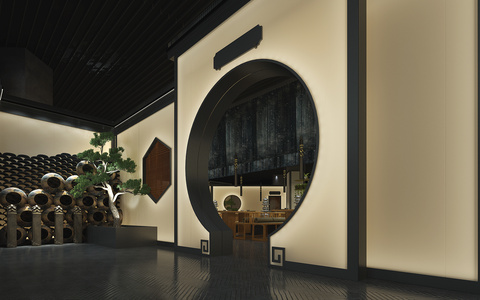 Z04-0702新中式餐厅门头入口酒罐子月亮门迎客松景观