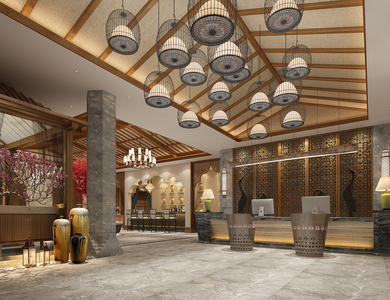 Z05-0621东南亚新中式酒店会所大堂大厅前台接待鸟笼吊灯花格罐子