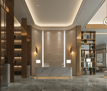Z09-0621新中式酒店会所大堂大厅前厅接待水吧台书柜书架