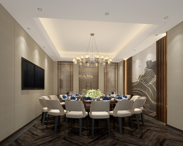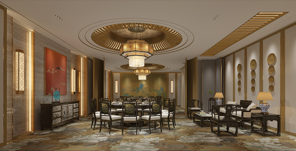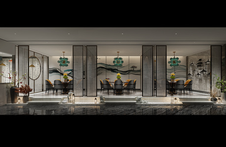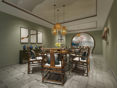Z05-0626中式餐厅包间联通包间景观石头植物陶罐花瓶