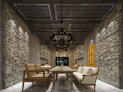 Z10-0626美式餐厅包间石头墙石头垄法式沙发麻绳吊灯