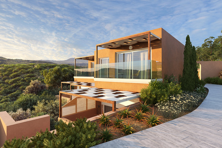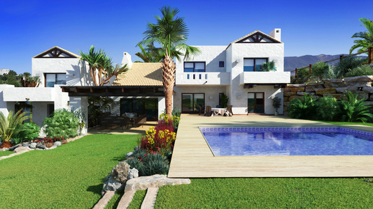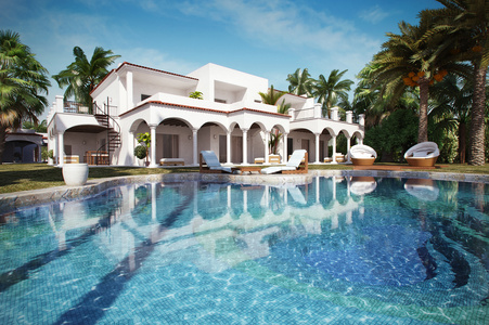 08欧式别墅洋房热带植物景观配景石头墙户外泳池椰子树 (1)