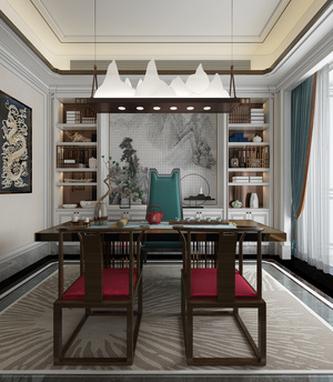Z12-0401新中式书房茶室书茶桌椅山形吊灯书柜