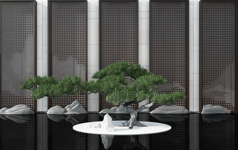 Z31-0411新中式园林迎客松背景墙松树石头景观