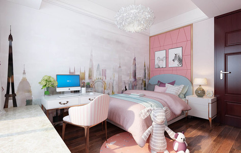 H08-0520现代儿童房女孩房床写字台羽毛吊灯