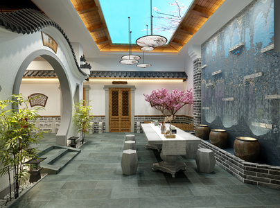 Z02-0605中式徽派建筑庭院石桌椅月亮门拱形门屋檐玉石栏杆