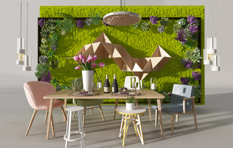 Z16-0528北欧现代苔藓多肉植物墙休闲椅子吧椅吊灯组合绿植墙