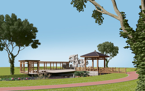 Z09-0519新中式园林花园植物景观廊架凉亭树荷花芦苇太湖石户外栏杆