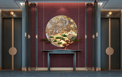 Z41-0704新中式玄关摆台迎客松松树大门花格屏风木门门厅