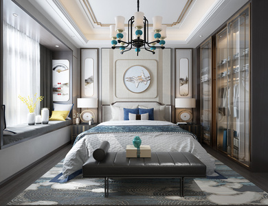 H07-0418新中式卧室双人床飘窗床头柜吊灯衣柜床尾凳