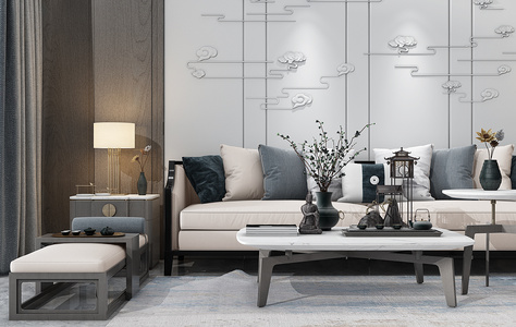 H03-0725新中式沙发茶几灯几铁艺建筑摆件卧榻凳台灯花瓶茶具祥云浮雕