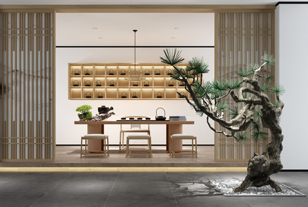 Z04-0401新中式茶室茶桌椅茶具松树植物景观