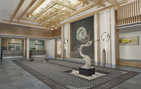 H12-0727新中式民宿酒店会所茶楼大堂大厅接待台吊灯松树景观水景干枝木梁架