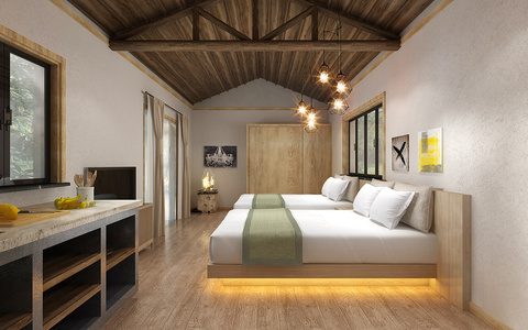 现代民宿酒店客房,标准间,火堆