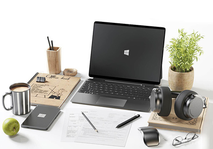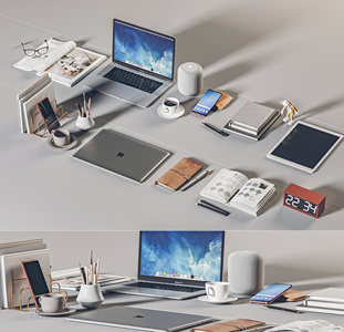 现代办公摆件,笔记本电脑,咖啡杯水杯,耳麦