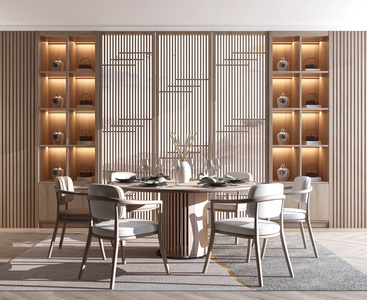 新中式圆形餐桌椅画格门扇