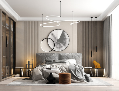 现代卧室,双人床床头柜,圆形坐墩皮墩