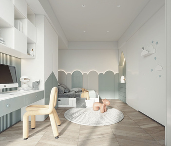 北欧儿童房学习桌,圆形地毯,衣柜柜子
