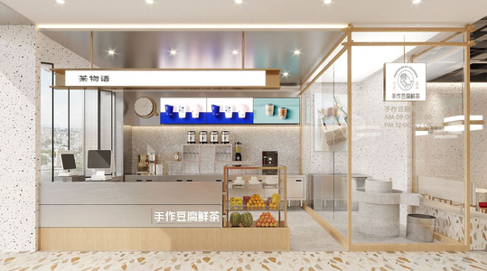 现代奶茶店,石磨,收银机,水果展示柜