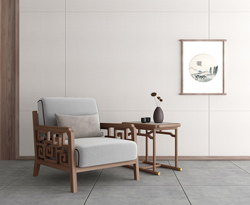 新中式现代单人沙发,圆形边几