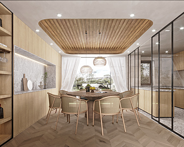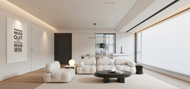 现代客餐厅,异形沙发,厨房橱柜岛台