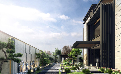 新中式别墅庭院景观花园,松树植物