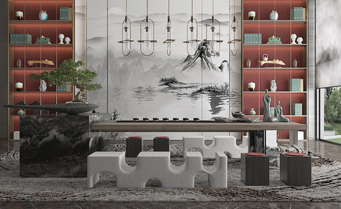 04新中式茶室,茶桌椅,茶台,盆景茶具茶壶