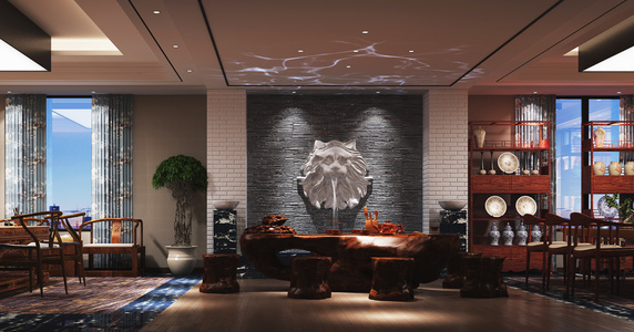 中式 茶室 水景,根雕茶台
