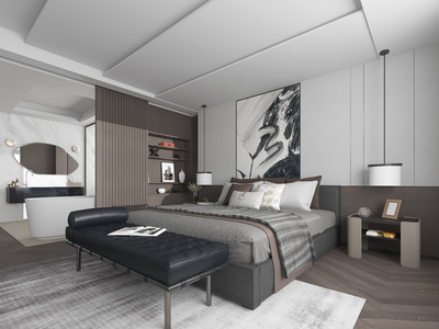 现代卧室,双人床,床尾凳,床头柜