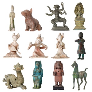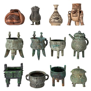 古董文物青铜器皿,宝鼎,陶罐摆件组合