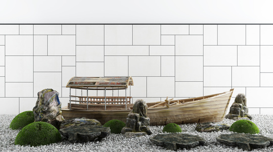 新中式景观小品,玄关造景 ,石头木船