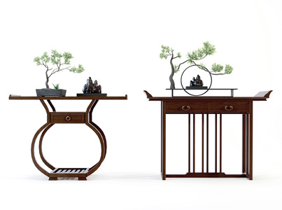 新中式玄关柜_松树摆件_盆景_假山3D模型