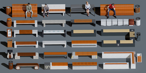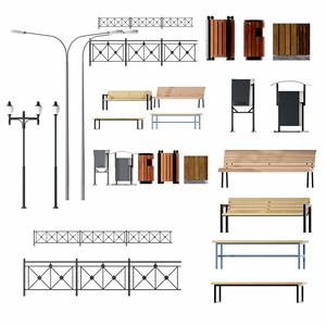 现代户外公共座椅,路灯,铁艺栏杆,垃圾桶组合