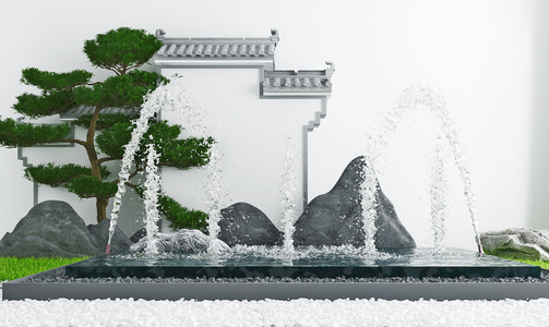 新中式景观水景园林造景,石头喷泉马头墙
