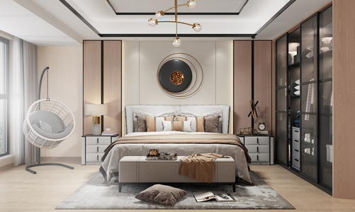 现代轻奢卧室,双人床,床尾凳
