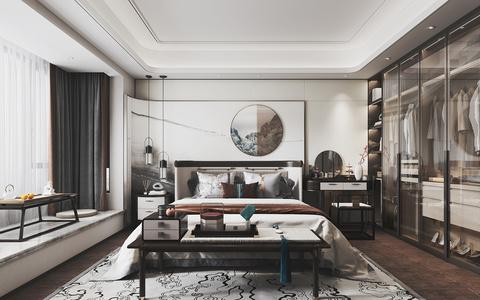 新中式卧室,双头床床头柜床尾凳,