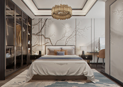 新中式卧室,双人床床头柜,衣柜