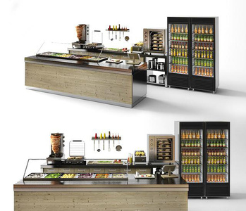 食堂收银台,餐台,食物,咖啡机,冰柜冷藏柜,食物柜