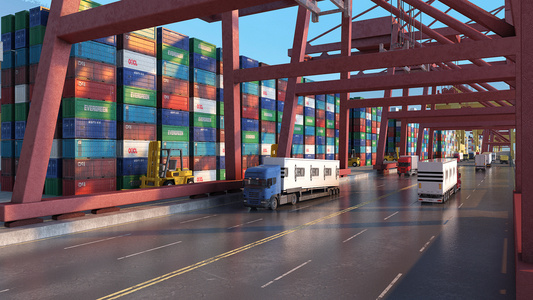 现代港口,码头集装箱龙门架,货车