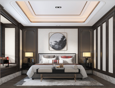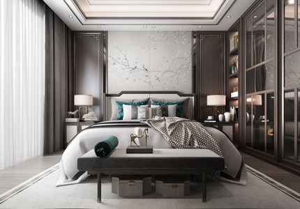 09新中式别墅样板间卧室,双人床,床尾凳踏,抱枕靠包,衣柜,床头柜台灯