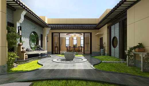 Z05-0923中式景观庭院屋檐水景植物