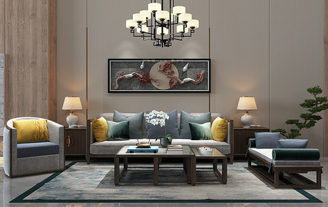 H08-0115新中式客厅沙发茶几窗帘躺椅摆件