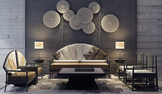 H22-0103新中式沙发茶几椅子屏风挂饰组合