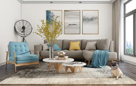 H12-1221北欧客厅沙发茶几宠物狗