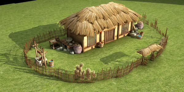 中式房子茅草屋,农场农家院,木栅栏,灶台水井,水桶